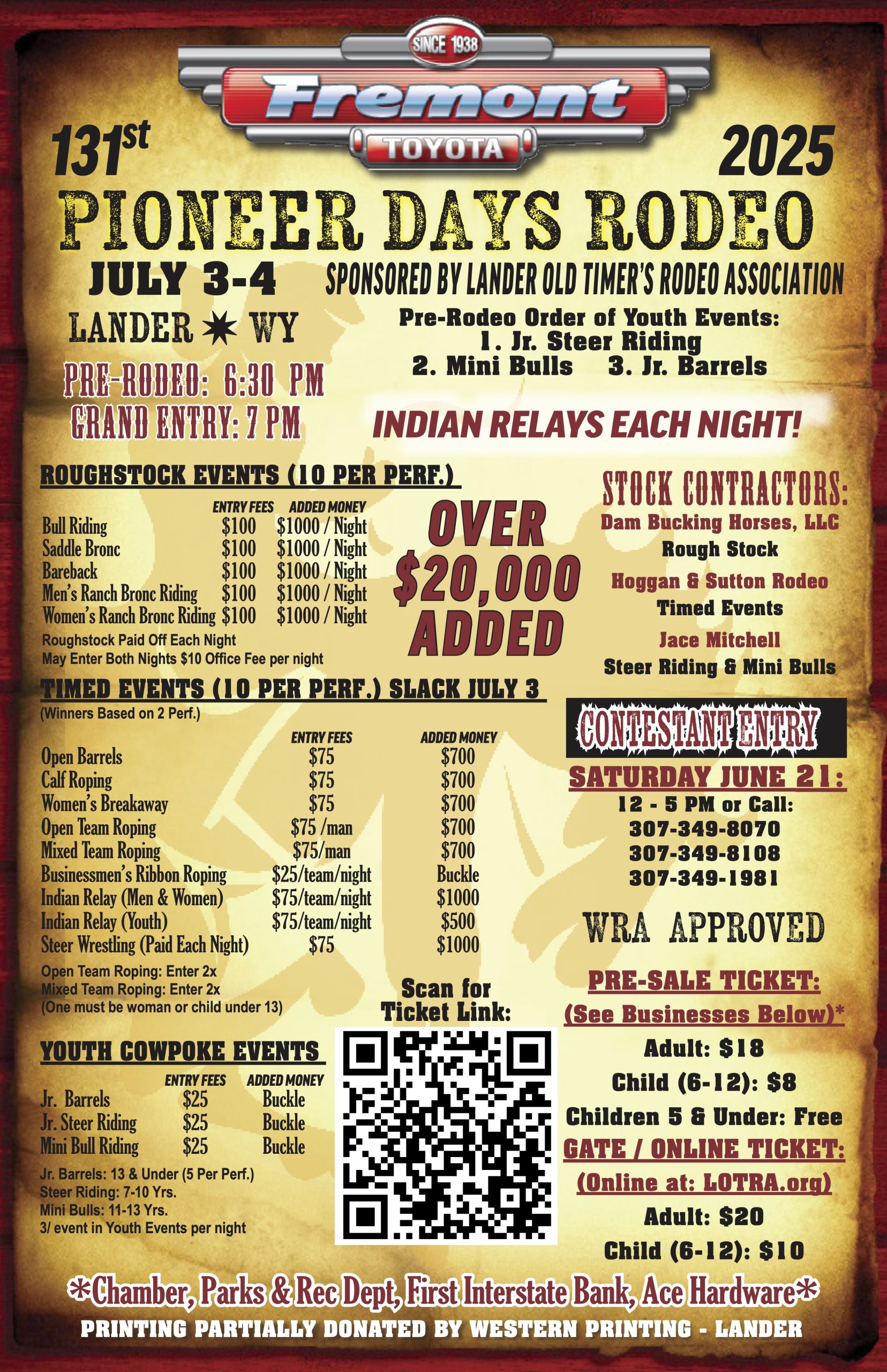 Lander’s 131st Fremont Toyota Pioneer Days Rodeo will be held July 3 and 4 in Lander as a highlight of Lander’s iconic Pioneer Days events. On July 3 and 4, there will be traditional western rodeo events including bull riding, saddle bronc and men’s and women’s ranch bronc riding, steer wrestling, barrel racing and breakaway, team and mixed team ropings.